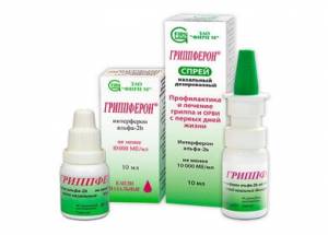 - Гриппферон. Действие этого лекарства на иммунную систему обусловлено наличием интерферона в его составе. Препарат производится в назальных каплях и в форме дозированного спрея для носа. Он назначается для лечения ОРВИ и для профилактики гриппа и простуды. Применение этого препарата разрешено с самого рождения.