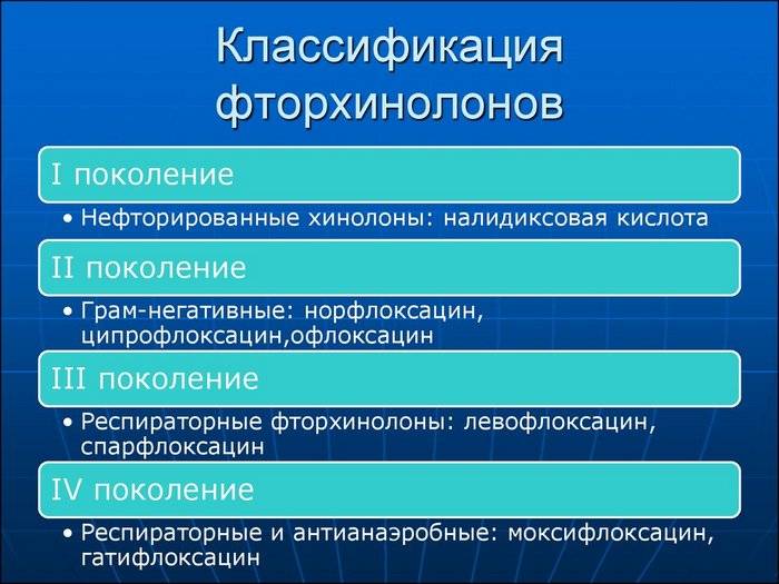 Хинолонами называют нефторированные антибиотики 1-го поколения. Остальные 3 поколения принадлежат к фторированным хинолонам – фторхинолонам.
