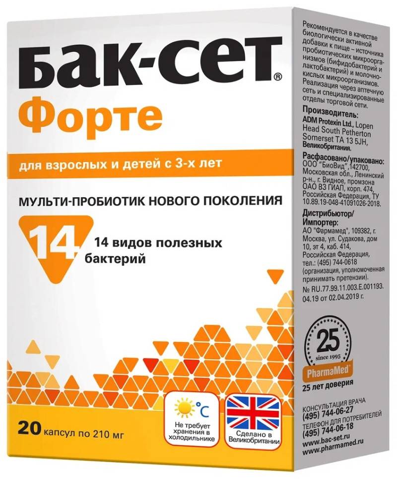 Этот препарат содержит около 14 живых положительных микроорганизмов. Формула считается одним из лучших аналогов Линекса. Она не только в полной мере способствует избавлению от дисбактериоза, но также помогает восстановить кишечник. Лекарственный препарат подходит для приема вместе с антибиотиками, его часто назначают при комплексной терапии. Бак-сет Форте отлично переносится организмом, в связи с чем его можно давать детям от 3 лет. По мнению покупателей – это недорогое и эффективное решение для борьбы с дисбактериозом.