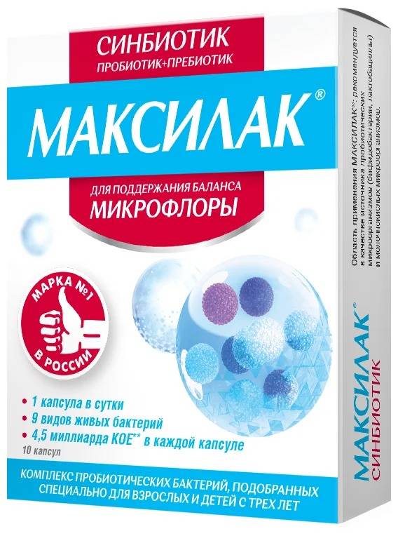 Максилак содержит комплекс пробиотических живых микроорганизмов и пребиотический компонент в виде фруктоолигосахаридов. Он может быть использован лицами с непереносимостью лактозы. Продолжительность терапии составляет от 10 до 30 дней.