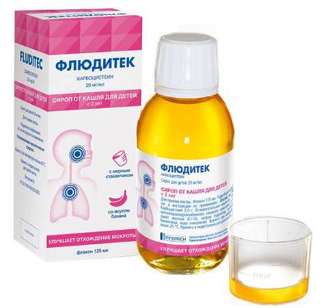 Флюдитек является муколитическим препаратом синтетического происхождения. В продаже средство представлено в фирменной картонной коробке, в которой находится 1 стеклянный флакон с сиропом объемом 125 мл. 2-процентный сироп можно употреблять с раннего возраста. Жидкое вещество имеет желтоватый цвет и включает 20 мг карбоцистеина на 1 мл. В составе детского Флюдитека присутствует банановый ароматизатор. Концентрация активного компонента в 5-процентном сиропе для пациентов старше 15 лет составляет 50 мг на мл. Жидкость имеет зеленоватый оттенок и карамельный запах.