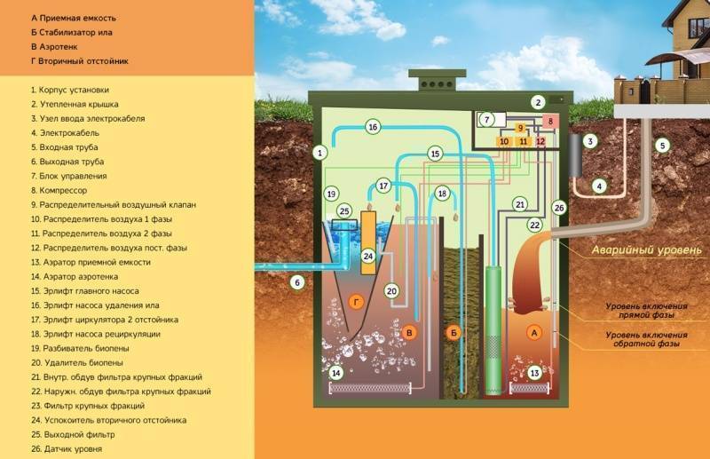 - Конструкция достаточно проста в обслуживании, а компрессоры работают долговечно. Если правильно эксплуатировать очистное сооружение, то нерастворимый осадок откачивается примерно 1 раз в год.
