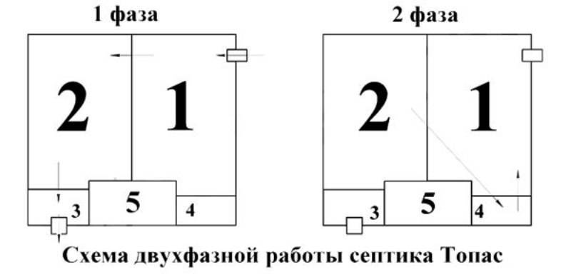 На схеме стрелками показано направление перемещения стоков в начальной и последующей фазах при полном цикле очистки