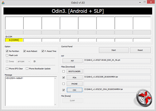 убедиться, что в Odin установлены галочки в пунктах «Auto Reboot» и «F. Reset Time». Если было указано расположение файла *.pit, то галка «Re-Partition» будет поставлена автоматически;