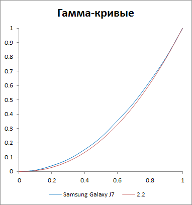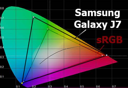 Максимальную яркость мы зафиксировали на значении 358,54 кд/м2, что не очень много по современным меркам – нынче смартфоны и планшеты уже тяготеют к значениям 400-450 кд/м2. Причем недавно протестированный Galaxy J5 «светит» на 450 кд/м2. С другой стороны, даже измеренного показателя вполне достаточно – как мы сказали, на солнце Samsung Galaxy J7 ведет себя неплохо. Яркость черного «нулевая» – особенность технологии OLED дает отличный черный цвет и практически «бесконечный» уровень контрастности.