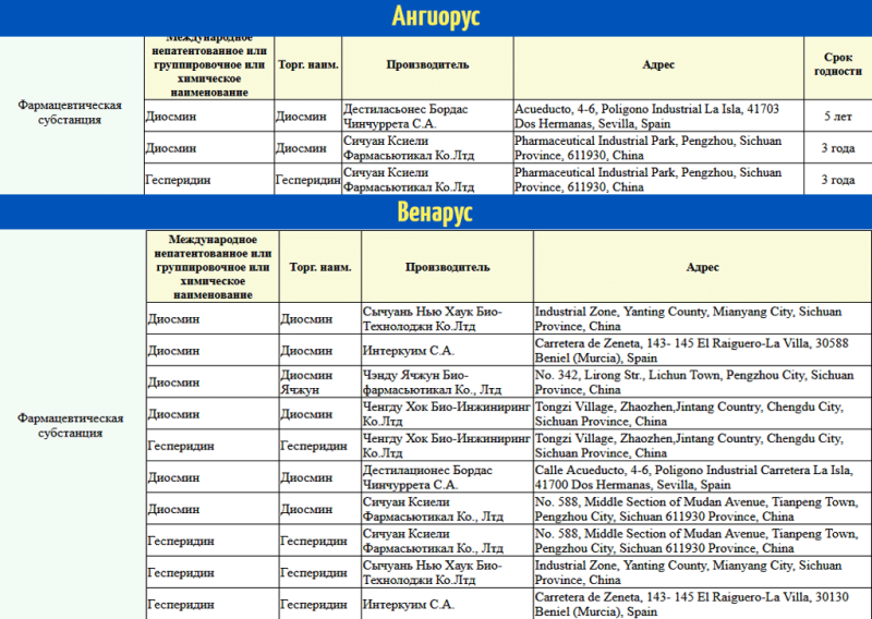 Разница в том, что при производстве препарата Ангиорус на предприятии «Синтез» используют субстанцию гесперидина в составе только китайского производства, а в Венарусе китайского и испанского. Происхождение диосмина в обоих препаратах: Испания или Китай, причем доля китайского составляет примерно 2/3.