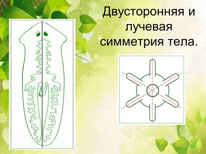 Плоские черви — более развитая форма жизни, чем изученные нами губки и кишечнополостные. Например, они обладают уже не лучевой, а двусторонней симметрией тела, кожно-мускульным мешком и системами органов.