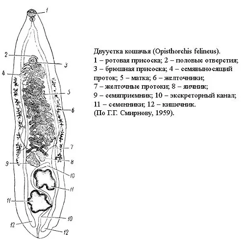 Другой представитель сосальщиков — кошачья двуустка. Этот паразит вызывает описторхоз, который может протекать бессимптомно, а может вызвать цирроз печени. Жизненный цикл двуустки проходит через два промежуточных хозяина: первым становится моллюск, а вторым — пресноводная рыба. Окончательным хозяином является любое млекопитающее, которое питается рыбой.