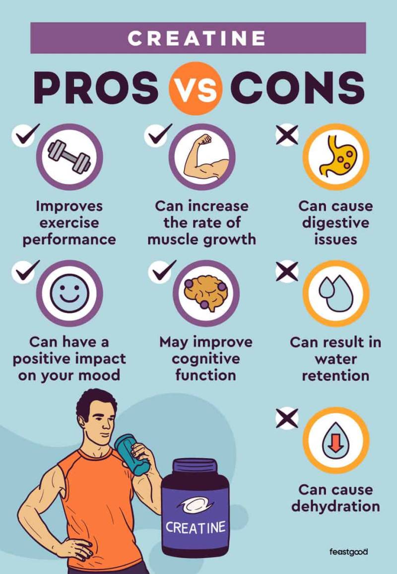 Can cause dehydration. Due to the fact that creatine pulls water into your muscles, there is less water circulating in the blood and a greater risk for dehydration. This can be easily mitigated by ensuring that you are drinking plenty of water while supplementing with creatine.