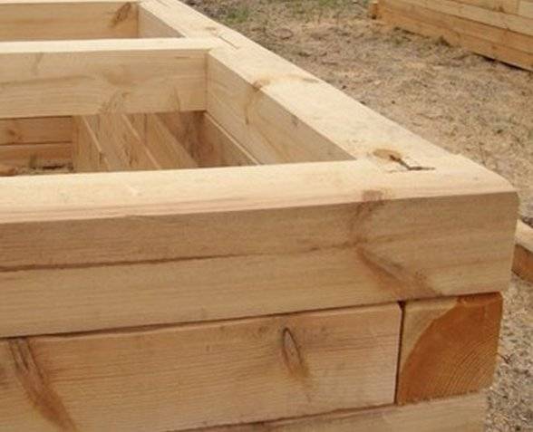 Выкладываем на фундамент обвязочный брус, который по углам может скрепляться одним из двух способов: