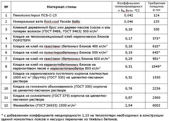 Таблица теплопроводности стен
