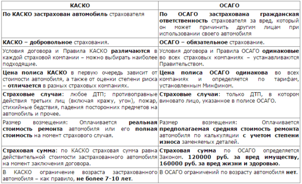 Таблица — Отличие программ автострахования каско и ОСАГО
