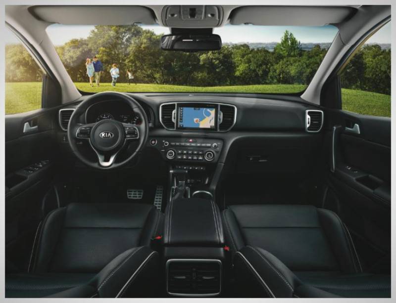 Дизайн интерьера Киа Спортейдж весьма привлекательный. Великолепная панель приборов с глубокими колодцами весьма эффектна, хорошо читает информацию. Рулевое колесо с 3-мя спицами похоже на спортивное – прекрасно держится в руках. Кресла спереди комфортные – в дальней дороге не ощущается усталости, с развитой поддержкой сбоку, удерживающей ездоков. На виду водителя консоль по центру, которая разделена на 2 блока. Задние кресла сформированы точно для двоих, но подголовники имеются для 3-х человек. Сидеть внутри комфортно, проем двери широкий – это облегчает посадку и высадку людей, потолок крыши высокий.
