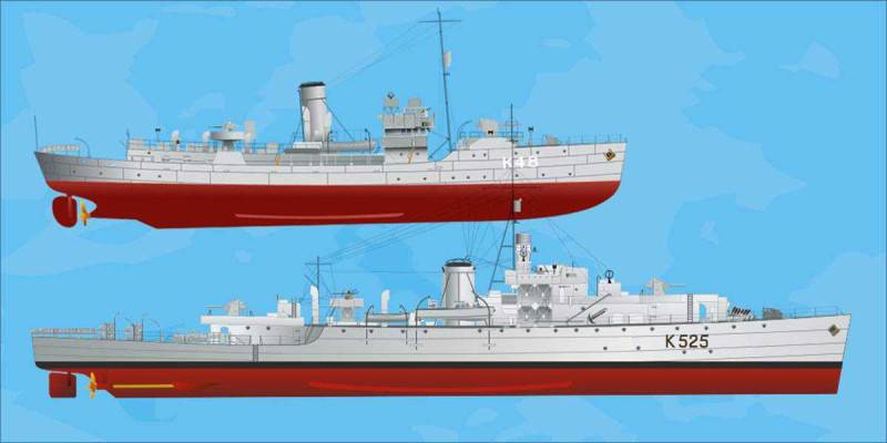 Корвет типа «Флауэр» и фрегат типа «Ривер» в одном масштабе