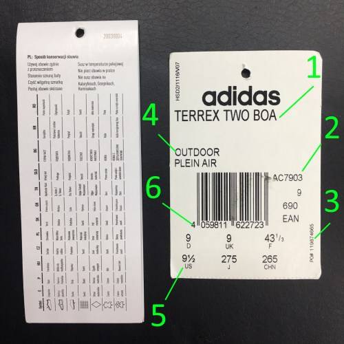 Обратите внимание на то, чтобы название и серийный номер совпадали с ярлыком сникеров. Ярлык с информацией, расположенный на языке обуви
