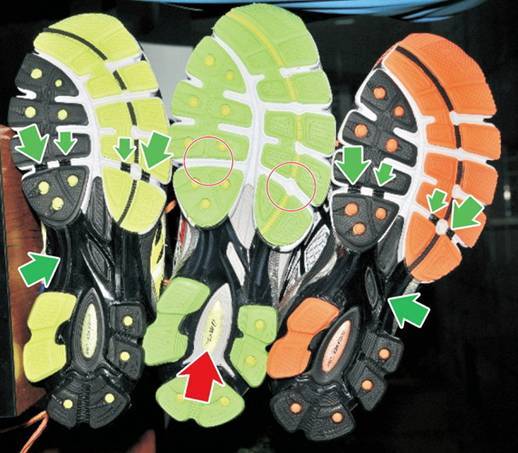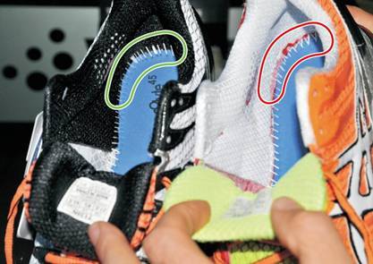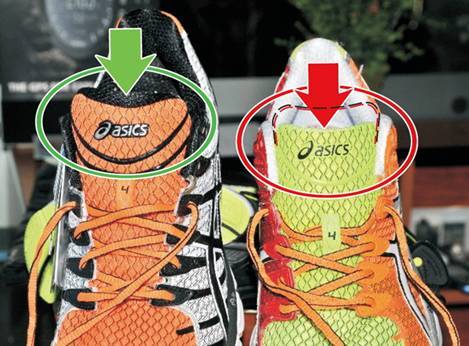 Предлагаем вам несколько способов, как проверить Asics на подлинность. Зелеными стрелками отмечены фирменные кроссовки, красными – контрафактные образцы.