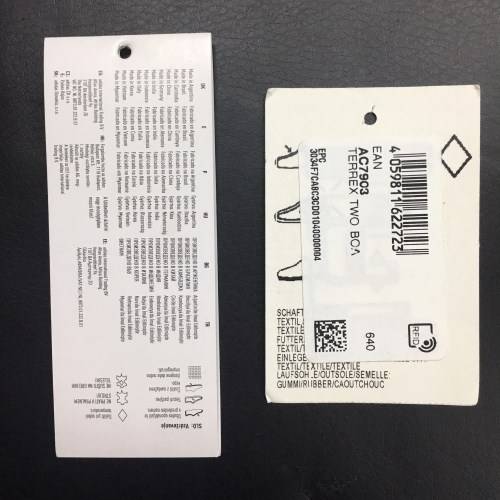 Бирка слева практически всегда идет с ней в комплекте. Никакой конкретной информации про конкретную пару/модель она не имеет. На ней лишь нанесена “легенда”: какие виды материалов могут использоваться при производстве обуви, в целом, и какими знаками они изображаются; какие страны занимаются производством обуви (Made in China, Vietnam, Indonesia и т.д.). И все это расписывается на десятках языках. В ней нет никакой конкретики про конкретную пару, бирка просто есть и всё.