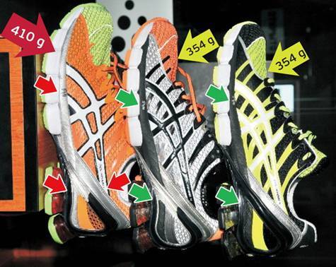 Настоящие Asics весят 354 грамма, тогда как подделки значительно тяжелее. Разница в весе может достигать 70-100 грамм. При изготовлении фейков используются более дешевые и, как следствие, более тяжелые материалы. Посередине подошвы оригинальных «Асиксов» имеется надпись Solyte. У подделок буквы вытянуты по высоте и нанесены некачественно.