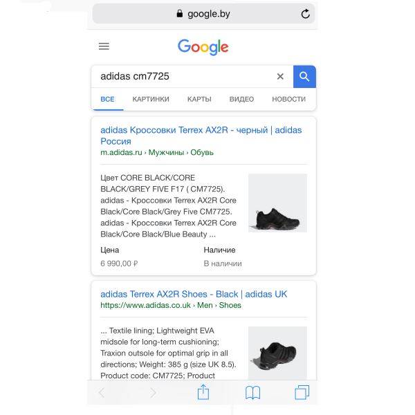 ”, далее смотрим: если сразу выдаёт ссылки на эту модель через официальные сайты, то класс, вот только сработает это на «свежих» моделях, т.е. на новых коллекциях или максимум прошлогодних. Искать на официальном сайте adidas.com модели даже двух летней давности бесполезно, не найдёте.