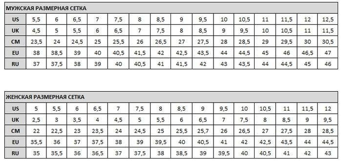 В производстве компании существует не только обувь для занятий спортом, но и повседневные модели обуви. И не стоит удивляться, что размерная сетка тоже будет отличаться.
