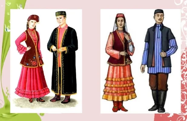 Национальный костюм казанских татар включает:1. Мужчины : штан (штаны широким шагом), камзол, кулмэк (рубаха с длинными рукавами), бишмет (длиннополый кулмэк), чоба (верхняя одежда), чикмень, джилян (халат), пояс, тюбетейка.2. Женщины : кулмэк, бишмет, нижний нагрудник, камзол, калфак.Цвета одежды: зеленый, сиреневый, голубой, желтый.