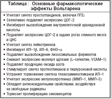 Под воздействием активного компонента происходит связывание простагландинов и угнетение их синтеза. За счет этого достигается противовоспалительный и жаропонижающий эффект препарата. Также Вольтарен обладает ярко выраженными болеутоляющими свойствами, поэтому его применяют как обезболивающее после незначительных хирургических вмешательств, при периодических болях у женщин, цефалгии.