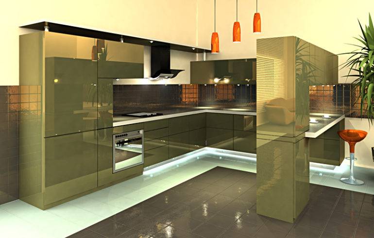 Впоследствии лицевая часть соединяется с торцевыми элементами, что позволяет получить блестящую поверхность с однородной текстурой. Характерная особенность кухонь из акрила – идеально ровная и сверкающая поверхность. Ее блеск схож со стеклянными или зеркальными поверхностями.