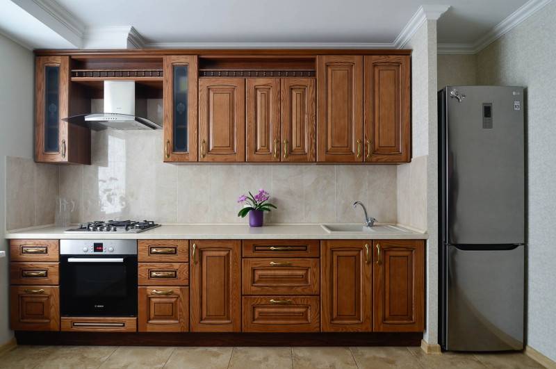 Кстати, чтобы сэкономить, кухни нередко делают частично из массива. Из дерева делают рамку, на которую приходится основная нагрузка. А внутреннюю часть (филенку) делают из шпонированного МДФ.