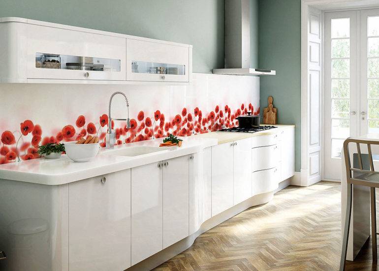 Отдельного внимания заслуживает пластиковая кухня с рисунком. Пластиковые фасады с нанесенным изображением смотрятся очень изысканно, но такой вариант не для маленького помещения, так как рисунок будет подчеркивать скромные размеры кухни.