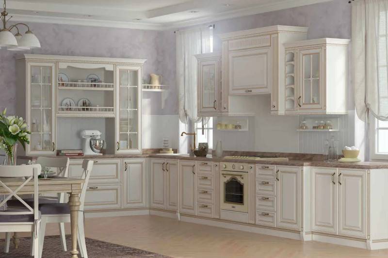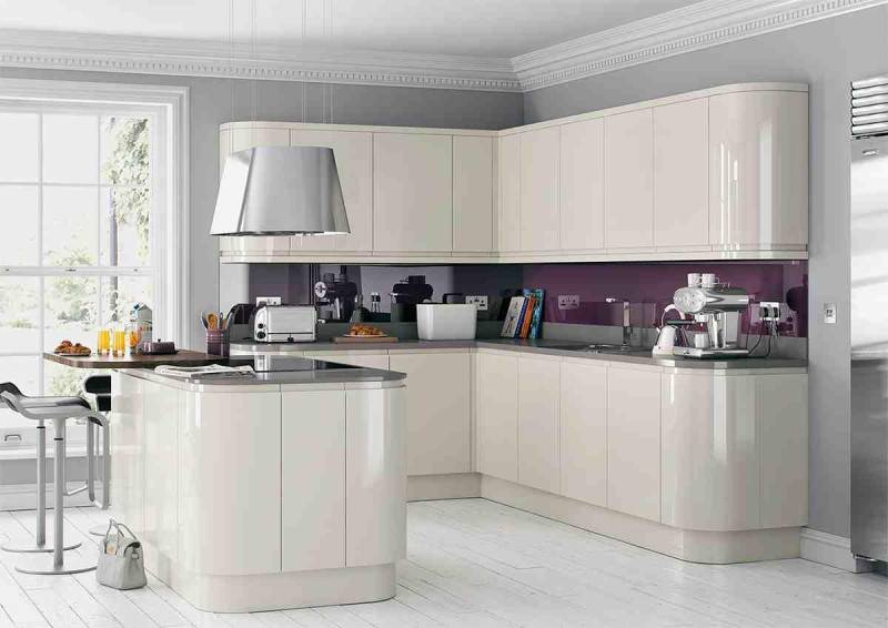 По своим свойствам эмаль ближе всего к крашеному МДФ. Мелкие дефекты тоже можно исправить без замены всего фасада. Форма кухни может быть любой, дверцы могут быть резными