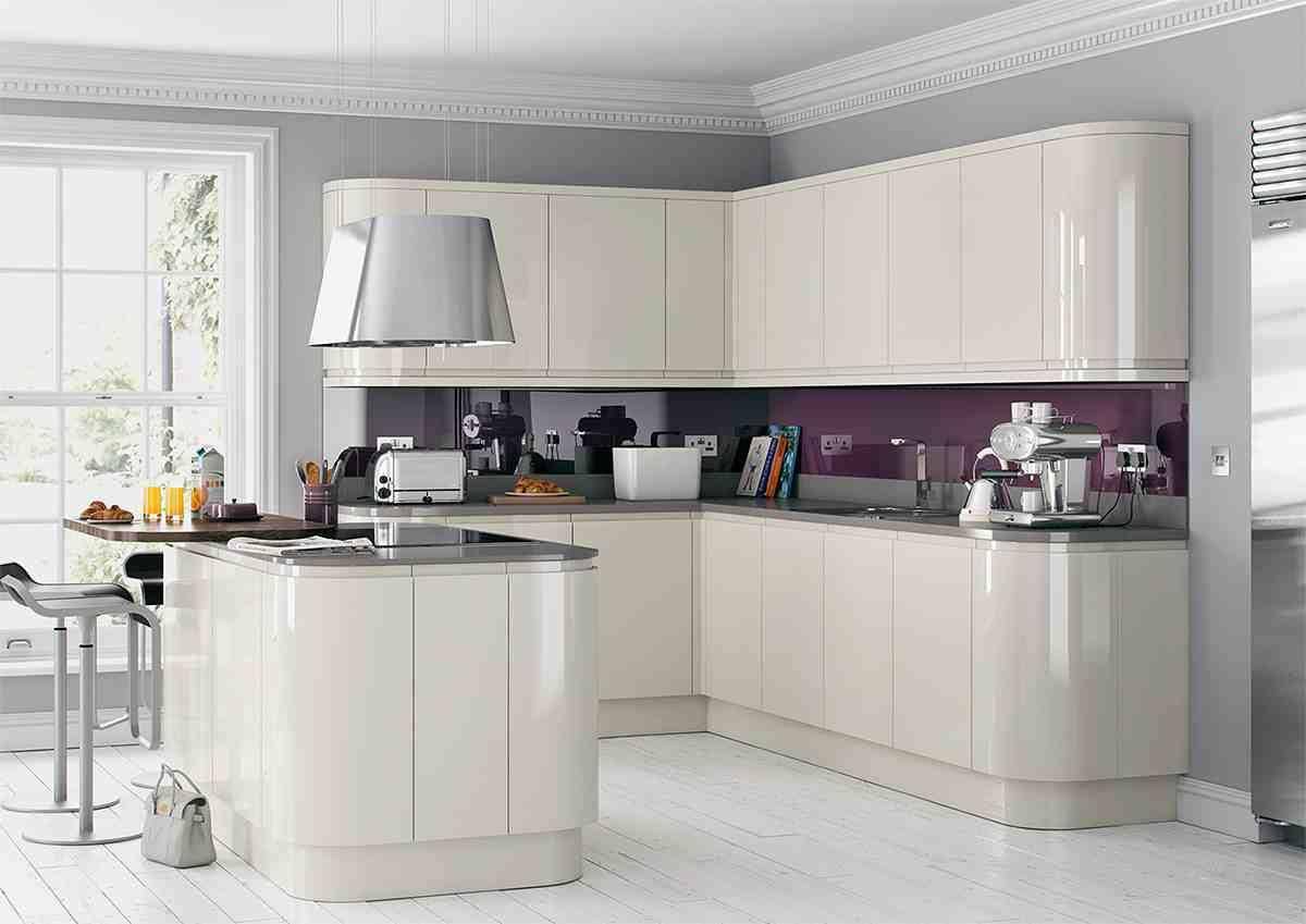 Для тех, кто больше стремится к уюту, подойдет стиль модерн. Он характеризуется плавными закругленными формами, асимметричными линиями. Волнообразные фасады из акрила наполнят помещение светом и теплом, а фартук из сталинита придаст оригинальности. Необычно и задорно выглядит двухцветный гарнитур, где один цвет – базовый нейтральный, а второй – насыщенный яркий. Например, молочный и красный. В последние годы особой популярностью пользуется цвет баклажан, но он скорее подойдет для больших кухонь, поскольку в малогабаритных помещениях будет смотреться мрачно.