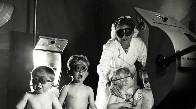 В общем, сначала удалось разобраться со вторым пунктом, когда активнее стал применяться синтетический диоксид кремния. А вот с безопасностью применения – вопрос оставался острым. Так как безопасность гарантировать самой лампой не удавалось, то приходилось ограничивать применение профессиональной отраслью (когда работник, использующий лампу проходит соответствующий инструктаж по Технике Безопасности перед началом работы), и также вводить пассивные средства защиты – непрозрачные очки. Использовались они как при обработке ультрафиолетом помещения и воздуха в нем, так и при непродолжительной (не более 2-3-5 минут) процедуре «кварцевания» (загорание с получением «солнечного» витамина D). Как это выглядело в реальности – можете ознакомиться на фотографии.