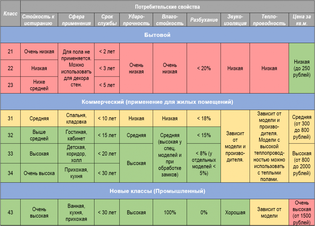 Существует несколько классов ламината, каждый из которых имеет свои особенности. Изначально выпускался ламинат двух видов, бытовой и коммерческий. К бытовому относились классы 21, 22, 23 и 24, а к коммерческому — 31, 32, 33, 34. В последнее время бытовой ламинат уже не выпускают, поэтому в настоящий момент для покупателей доступны четыре класса ламината: 31, 32, 33, 34.