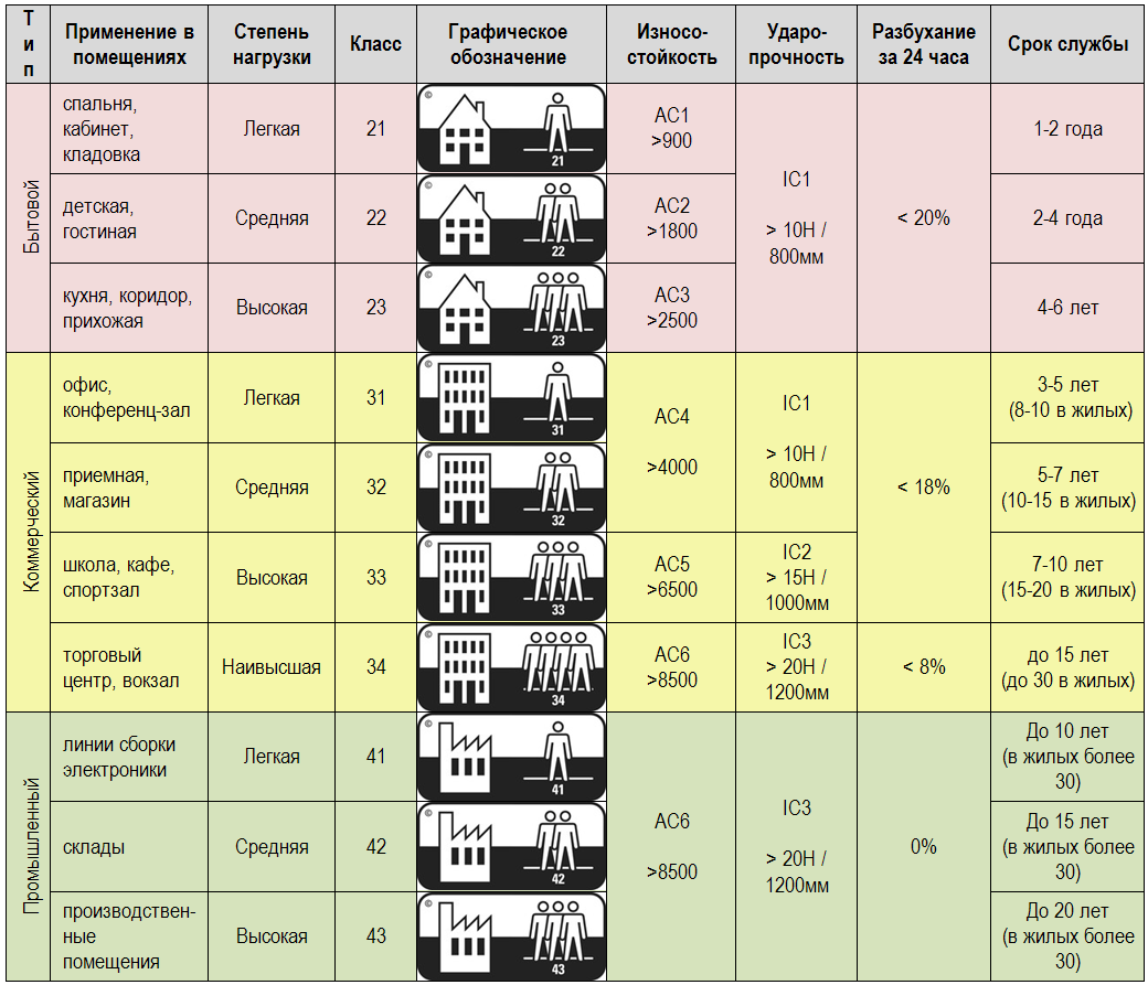 Согласно этому показателю различают бытовой и коммерческий ламинат. Последний рассчитан на более интенсивное использование, ходьбу по покрытию в обуви, постоянное увлажнение, попадание химических веществ. На самые прочные виды покрытия нанесен прозрачный защитный слой, увеличивающий срок службы доски.