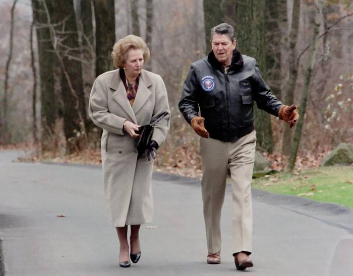 Президент США Рональд Рейган прогуливается с премьер-министром Великобритании Маргарет Тэтчер в Кемп-Дэвиде. 1986 г.
