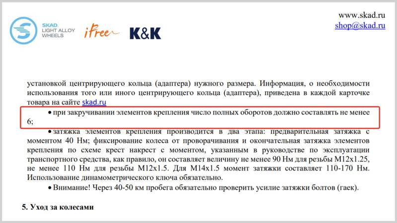 На моём автомобиле стоят литые диски Российского производителя «СКАД». В паспорте изделия присутствует необходимая рекомендация: «При закручивании элементов крепления число полных оборотов должно составлять не менее 6».