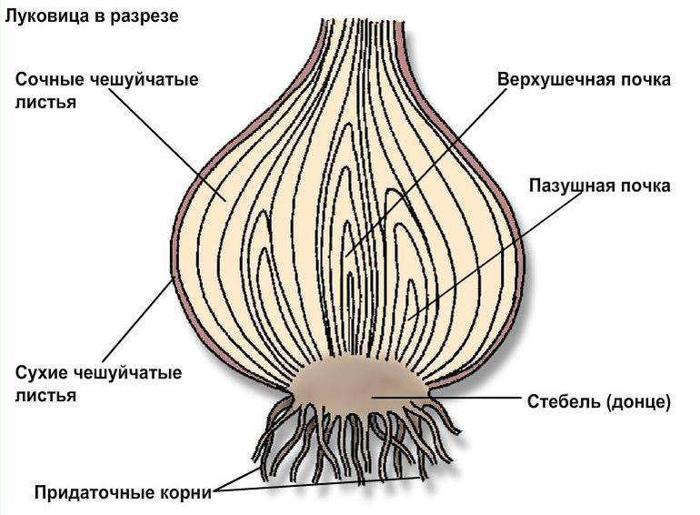 Луковица представляет собой подземный побег с листьями, вплотную прикрепленными к донцу. Строение луковицы у разных растений одинаково, но может отличаться по форме, размеру. По своему строению все луковицы схожи с привычным репчатым луком.