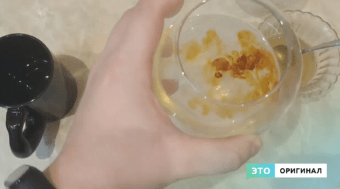 Налейте в стакан 100 мл холодной воды, добавьте столовую ложку меда и такое же количество столового уксуса. Если после этого жидкость начала шипеть, на ее поверхности появилась пена – это признак добавки мела, который вступает в реакцию с уксусной кислотой.
