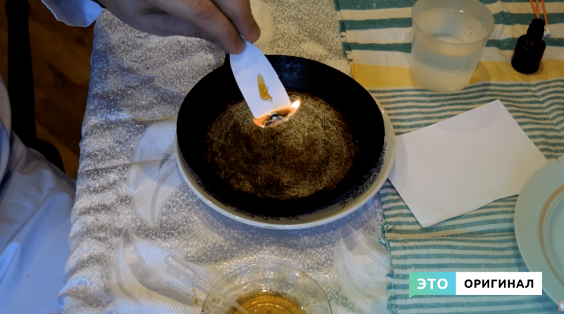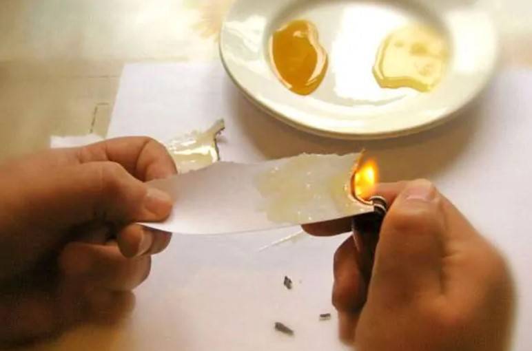 - Этот способ подойдет для разоблачения закристаллизованного меда. Достаточно взять немного янтарной жидкости и нарисовать ей слово на бумаге. Затем поджечь рисунок. Высокое качество продукта определится, если бумага сгорела по бокам, а поверхность со сладкой картинкой осталась нетронутой. В противном случае покупателю пытаются сбыть разбавленный продукт.