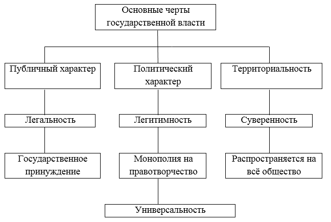 Государственная власть представляет отношения господства и подчинения, которые основаны на управлении, координации волевых действий людей и опираются на воздействие и возможность принуждения со стороны государства.