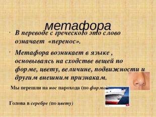 метафора В переводе с греческого это слово означает «перенос». Метафора возникает в языке , основываясь на сходстве вещей по форме, цвету, величине, подвижности и другим внешним признакам. Мы перешли на нос парохода (по форме) Мы Голова в серебре (по цвету)