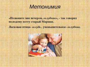 Метонимия «Позвоните мне вечером, голубчик», — так говорил молодому поэту старый Маршак. Ласковая птица- голубь , уменьшительное- голубчик.