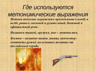 Где используются метонимические выражения Метонимические выражения применяются всюду и везде, равно в ласковой и ругательной, бытовой и официальной речи. Названия тканей, оружия, вин – метонимия. Бостон – название ткани ,танца, винчестер- охотничье ружьё, получившее название от английского города.