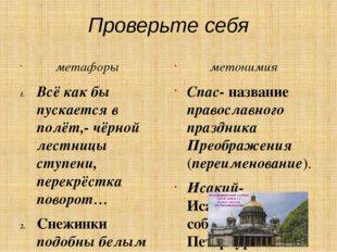 Проверьте себя метафоры Всё как бы пускается в полёт,- чёрной лестницы ступени, перекрёстка поворот… Снежинки подобны белым звёздочкам в буране, Снег ,подобно человеку, идёт(стёртая метафора) метонимия Спас- название православного праздника Преображения (переименование). Исакий- Исаакиевский собор в Санкт- Петербурге (переименование)
