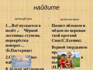 найдите метафоры 1…Всё пускается в полёт ,- Чёрной лестницы ступени, перекрёстка поворот…(Б.Пастернак) 2.Снег идёт, снег идёт. К белым звёздочкам в буране тянутся цветы герани…(Б.Пастернак) метонимию Пахнет яблоком и мёдом по церквам твой кроткий Спас(С.Есенин). Верной твердынею православья врезан Исакий в вышине…(Н.Гумилёв)