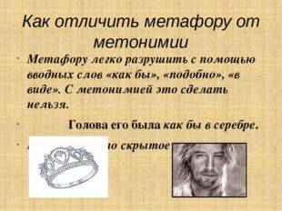Как отличить метафору от метонимии Метафору легко разрушить с помощью вводных слов «как бы», «подобно», «в виде». С метонимией это сделать нельзя. Голова его была как бы в серебре. Метафора- это скрытое сравнение.