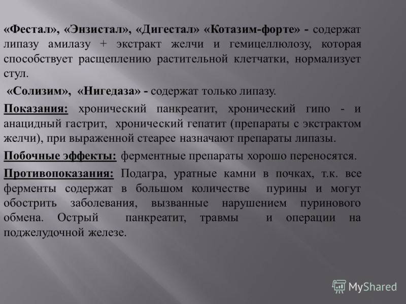 Противопоказания – острый панкреатит;- обострение хронического панкреатита;- повышенная чувствительность к панкреатину или другим компонентам препарата;- наследственная непереносимость галактозы, недостаток лактазы или синдром глюкозо-галактозной мальабсорбции;- детский возраст до 3 лет (неделимая лекарственная форма).