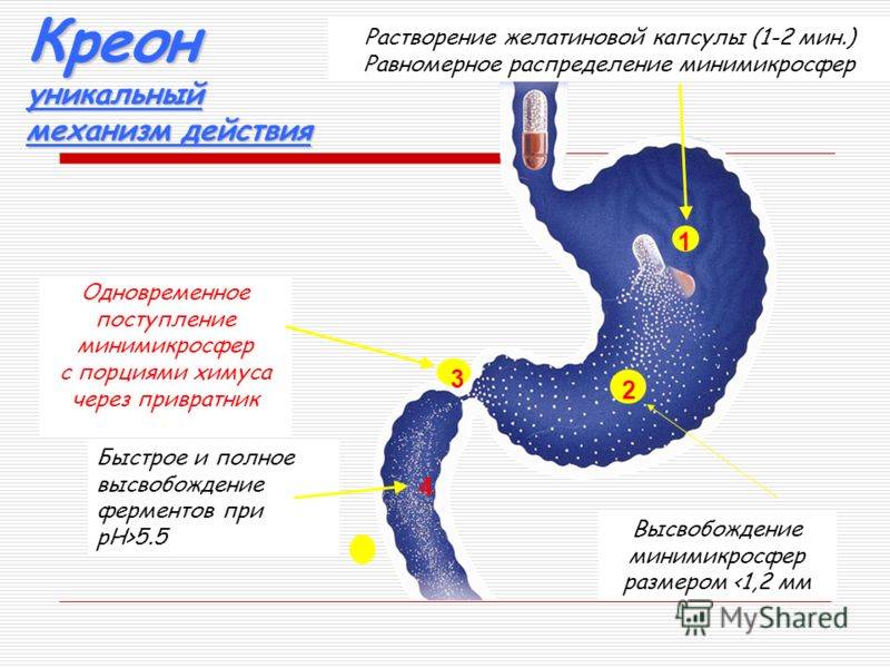 Чтобы ответить на этот вопрос, рассмотрим детально механизм действия обоих препаратов. В состав капсулы Креона входят микросферы, расщепляющие еду. Желатиновая оболочка уберегает их от влияния желудочного секрета. Креон прекрасно перемешивается с едой и быстро проникает в кишечник, в котором растворяется.