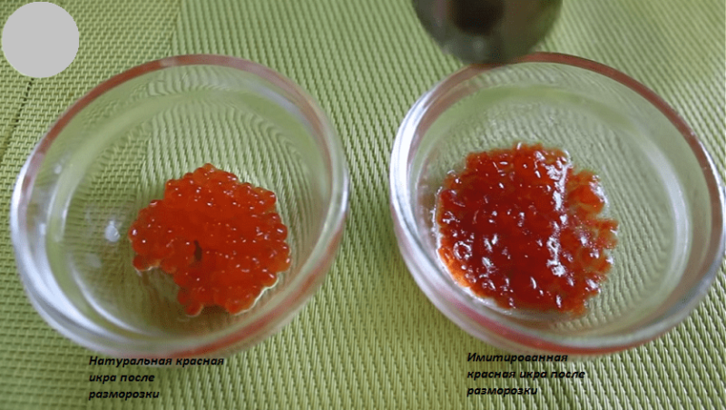 Для опыта необходимо поместить немножко икры в морозильную камеру. Настоящая обладает морозостойким свойством, то есть икринки не изменятся под влиянием отрицательных температур. После разморозки образец икры, потерявший форму и внешнюю привлекательность, стоит выбросить. А прошедшую тест икру, которая сохранила свои внешние признаки после испытания холодом, можно смело кушать.