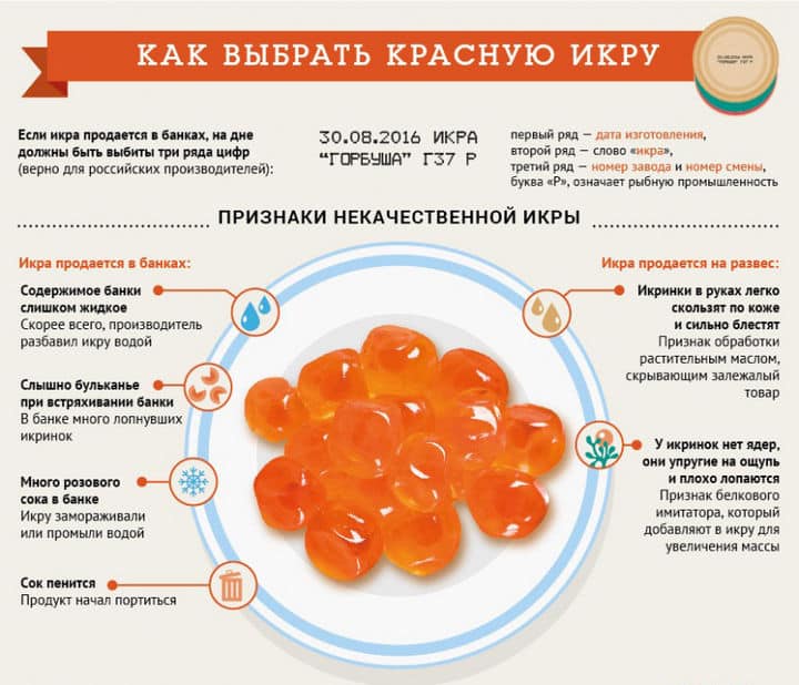 При выборе банки с икрой в магазине, прежде всего обратить внимание на упаковку и информацию напечатанную на этикетке. Предпочтение лучше отдать икре в стеклянной таре — икру можно визуально рассмотреть